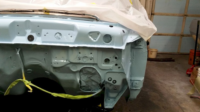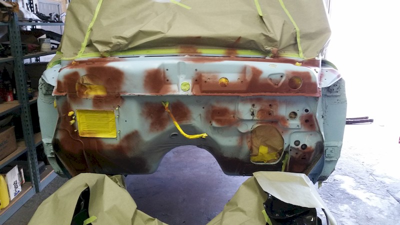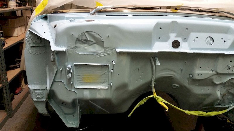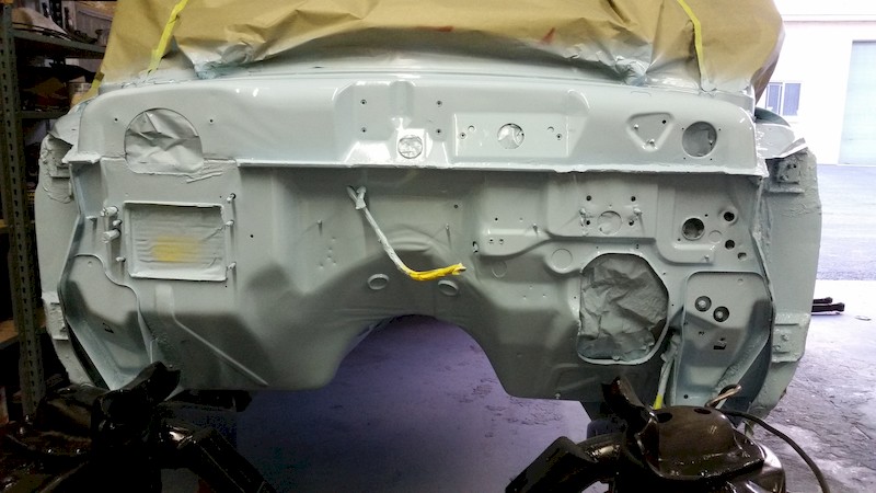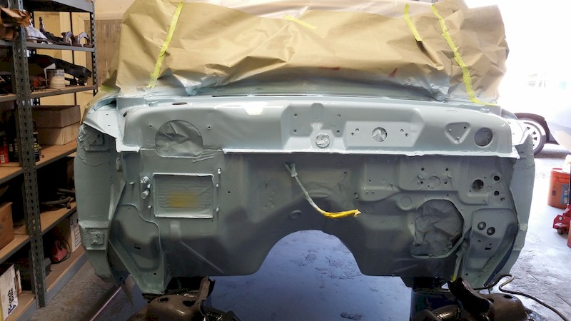 As soon as the frame paint had set up, George removed the body masking to reveal this great view! Wow! At this point, the holes in the firewall can be unmasked and prepared for installation of the master cylinder, wiring harness, rubber hole plugs, and other details.