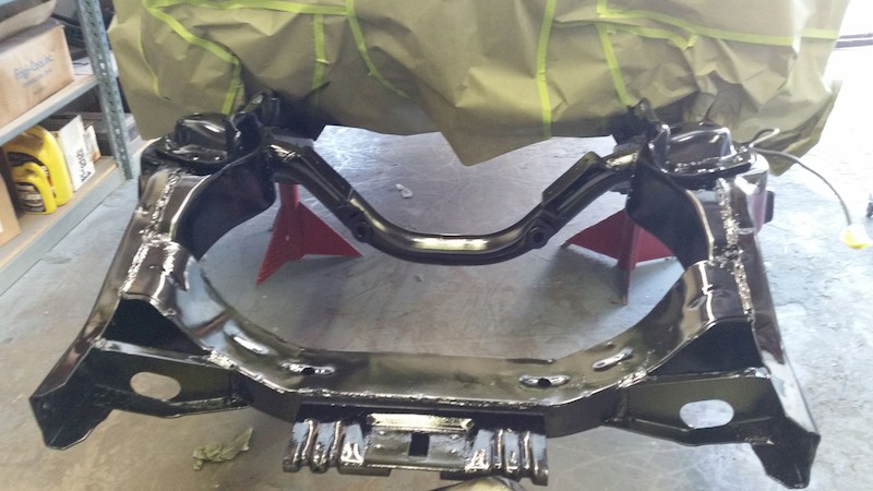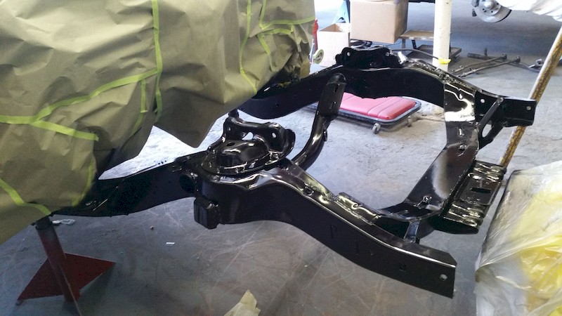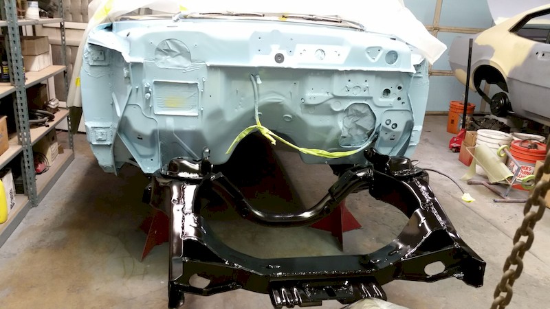 I had initially thought we could remove the body from the frame, then to have the bare frame sand blasted and power coated. That process would have allowed George and Wayne to have cleaned the underbody and spray it, and the firewall, in the factory blue color. After some research, I determined that it would be too dangerous to do so since I don’t own an hydraulic lift that could have easily, and safely, lifted the body. So, after consulting with Mike, George and Wayne, we decided to clean the body and frame in place and paint the same. What a job!