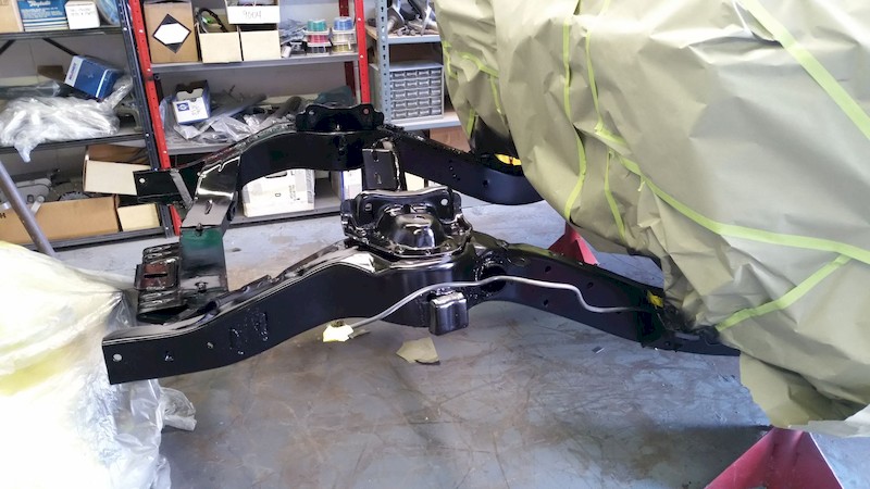 Using custom matched Valspar acrylic enamel, George sprayed the firewall and Wayne sprayed the entire under body, section by section, after thoroughly cleaning it and priming a few areas.